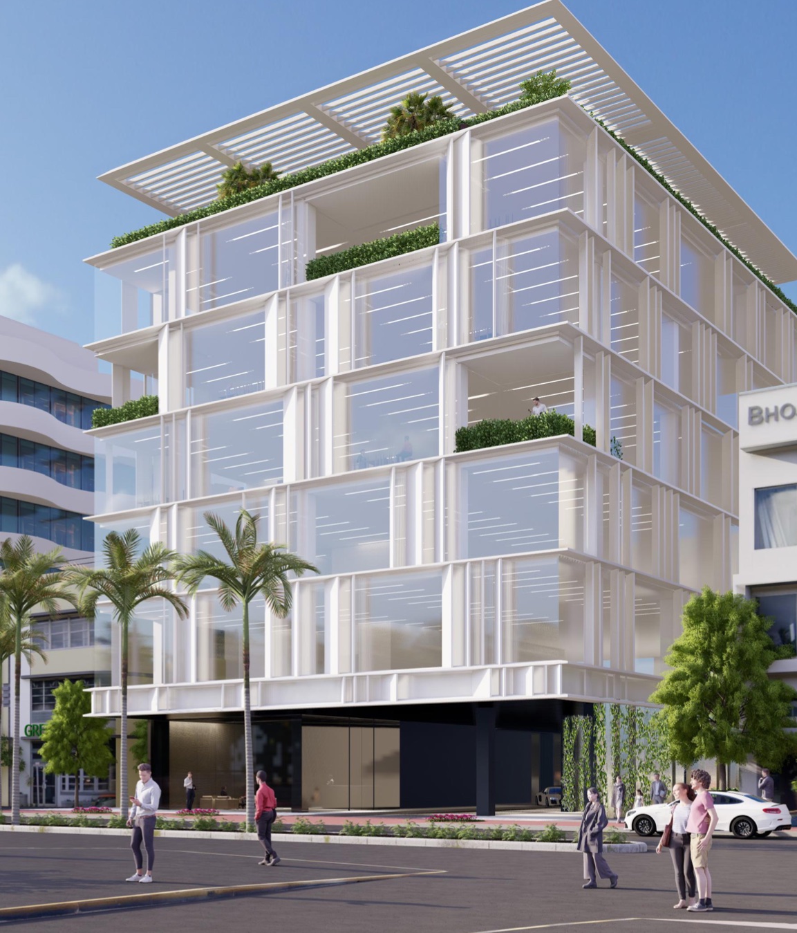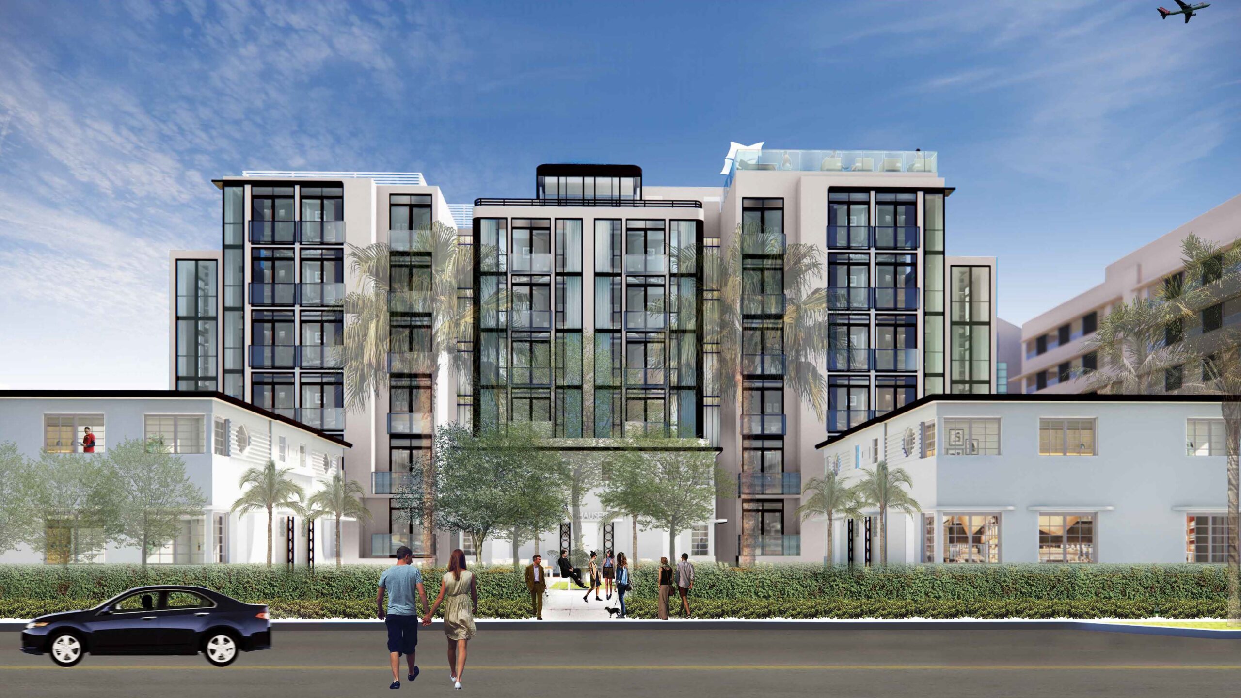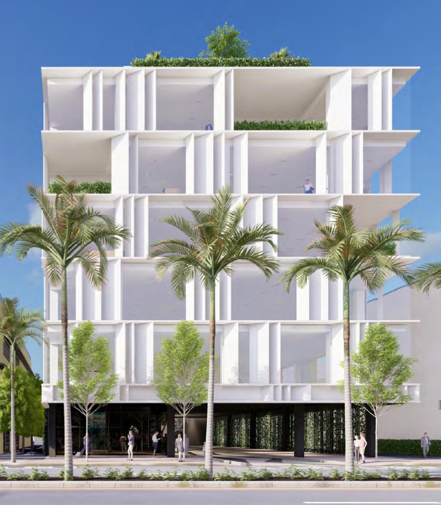 MDPL believes that the proposed massing of this building is overwhelming to the adjacent historic building. Rather than blending in with the surrounding neighborhood context, it seems to overwhelm it. In reviewing the building program, approximately 50% of the floors appear to be dedicated to parking – though there is no required parking in the zoning code for this lot. We also are concerned about how the Palm Trees on the sidewalk could grow, as the building appears to jut out towards the sidewalk. We share the Staff’s concerns about the ground-level activation and materiality. However, we believe that only resolving this misses the bigger picture – the massing of this proposed structure is too large. We would suggest: