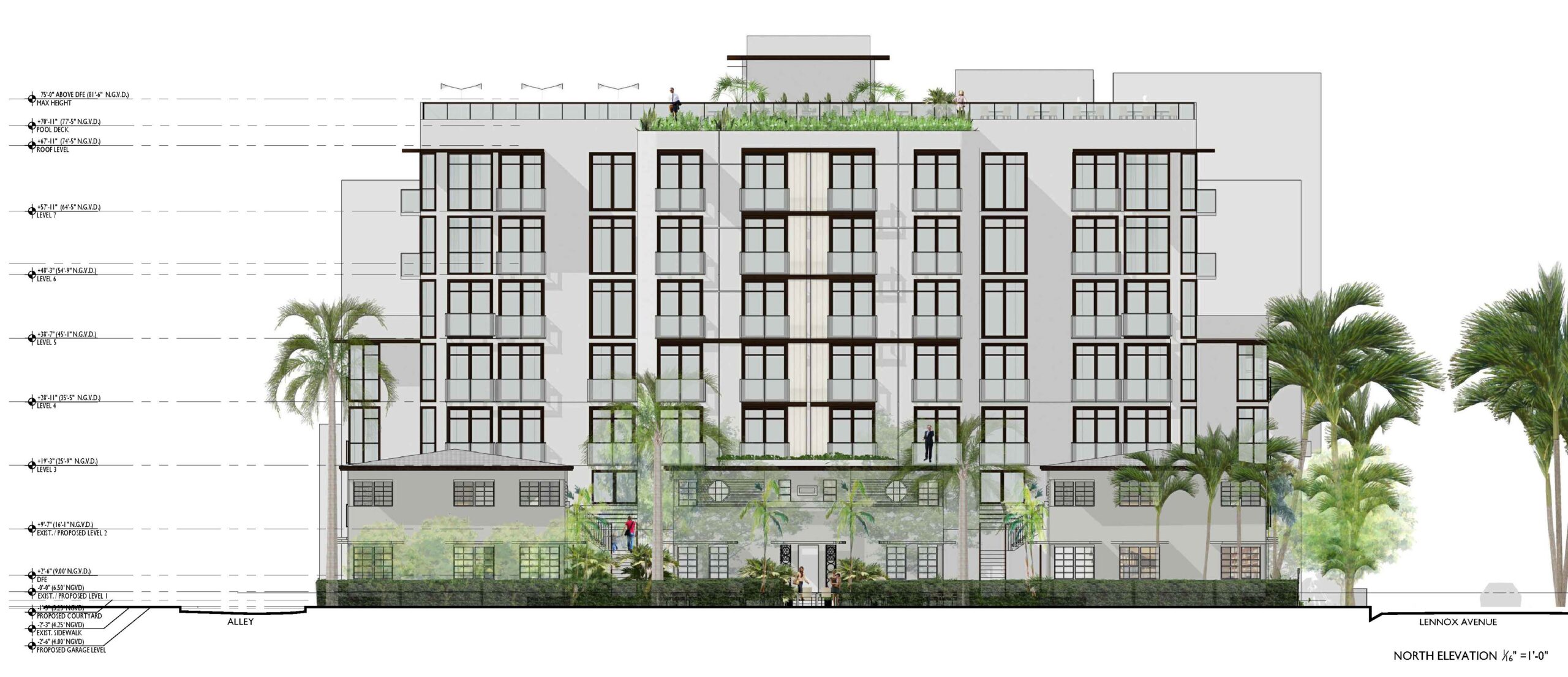 - Relocation of the parking lifts to the east(alley) side of the tower, allowing for the elimination of the driveway and the relocation of seventh level hotel units to the first and second levels along Lenox Avenue. Further, staff would note that the parking area at the first level of the tower along Lenox Avenue requires the introduction of residential or commercial use activation. The applicant is currently proposing n bike rental office with outdoor bicycle parking, a fire pump room and a domestic water pump room in this area, which do not satisfy the active use requirement. Staff’s recommendation to relocate hotel units from the seventh level to the first and second levels of the addition would resolve this deficiency.