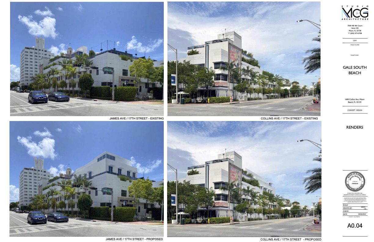 Additionally, as part of the project, the applicant is proposing to construct a 1-story rooftop addition on top of the existing 1-story rooftop addition of the Gale Hotel building in order to introduce an additional meeting room. This room will be located within the Collins Avenue line of sight. As such, staff recommends that the new addition be setback a minimum of 5’-0” from the existing eastern wall. Further, the applicant is proposing to relocate the existing mechanical equipment for the entire hotel, including the chiller from the roof of the existing 1-story rooftop addition of the Regent Hotel to the roof of the new fifth level. This mechanical equipment will be visible from Collins Avenue. Staff would note that inadequate information regarding the rooftop mechanical equipment and screening has been submitted.