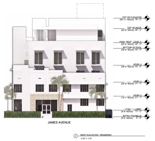 As part of the Certificate of Appropriateness analysis, staff is recommending that the bar counter area be shifted to the western side of the pool deck away from the eastern deck edge. This modification will eliminate the bar counter from view from James Avenue.