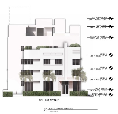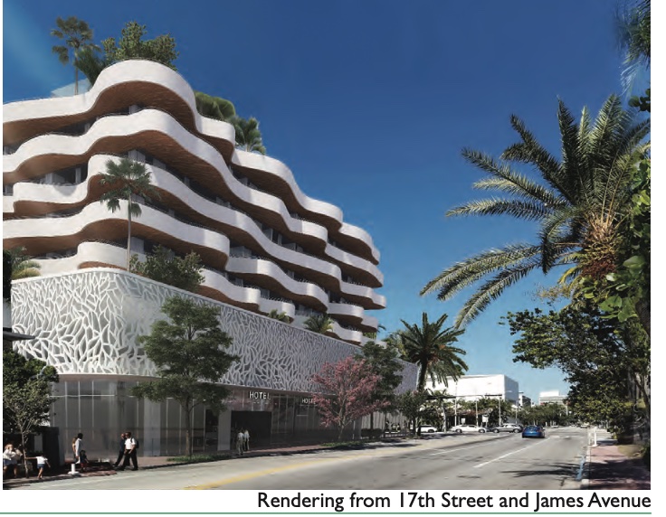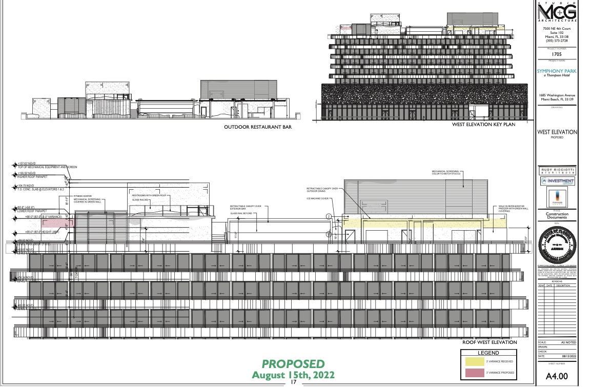 An application has been filed requesting modifications to a previously issued Certificate of Appropriateness for the total demolition of the existing building and the construction of a new hotel including variances to reduce the required tower front setback for residential uses, to exceed the maximum allowed projection into required yards, to exceed the maximum number of stories and maximum building height, to reduce the required width of a drive aisle and to eliminate the distance separation required from structural columns to a drive aisle. Specifically, the applicant is requesting approval for design modifications to the roof deck/8th level of the building and modifications to the previously approved variance for the maximum building height.