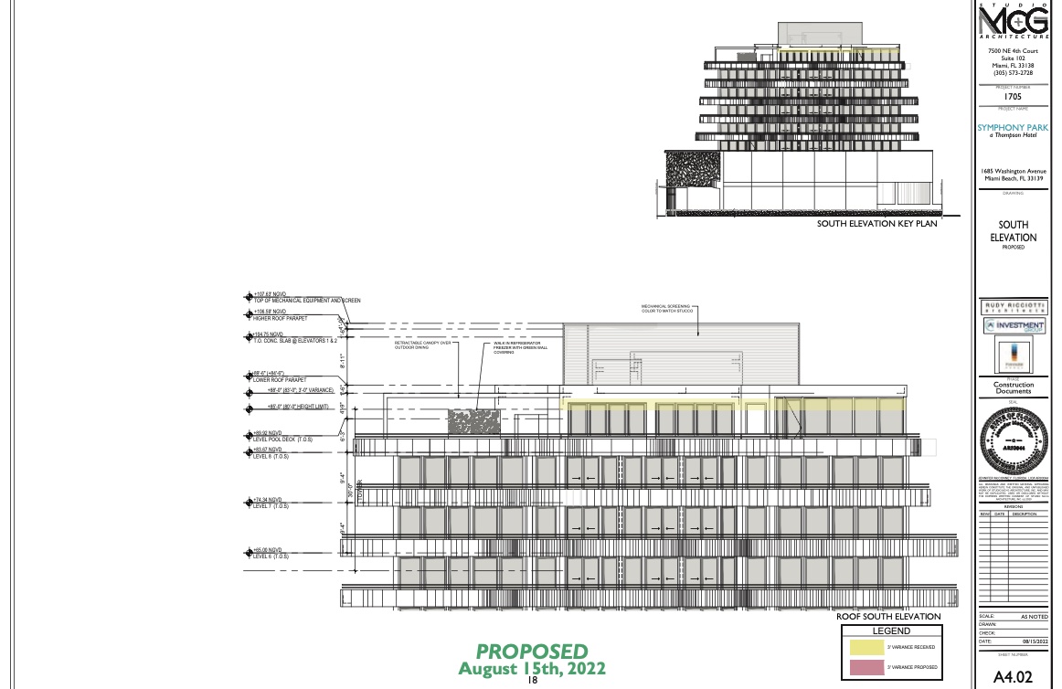 As part of the initial 2018 Board approval, the applicant was granted a variance to exceed the maximum building height by 3’-0” for the restaurant and kitchen located at the south end of the roof deck level. The applicant is currently requesting to expand the area subject to the 3’-0” increase in height to include the rooftop fitness room and the pool bar counter. As noted in the preceding analysis, both elements were shown as part of the approved building permit.