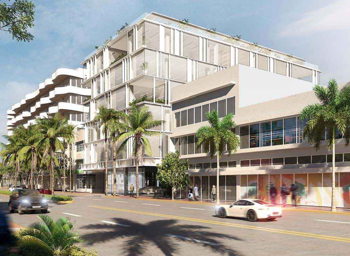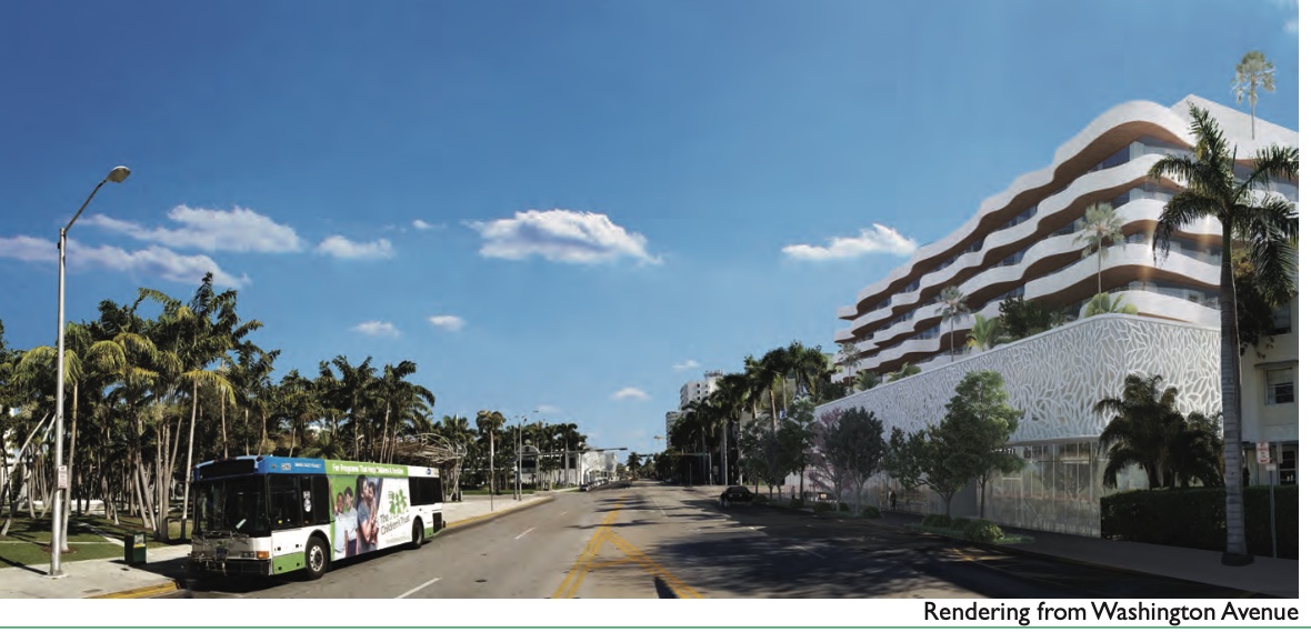 Located on one of the most heavily traveled commercial corridors in the City, the upper levels of the proposed building is generally compatible with its neighbors in terms of its overall scale and massing. While the design of the upper façade has been successfully articulated and developed, unfortunately the same cannot be said at the ground level along Washington Avenue. In this regard, as presently configured, the proposed driveway and drop-off area is exceedingly oversized and grossly out of scale with the established character and context of the immediate area. In its current form, the entry driveway, with a vast, gaping depth, would occupy significant urban space, immediately abutting a contributing building. Active building form fronting Washington Avenue, with a much more limited vehicular curb cut entry, would be the most appropriate design option at first level.