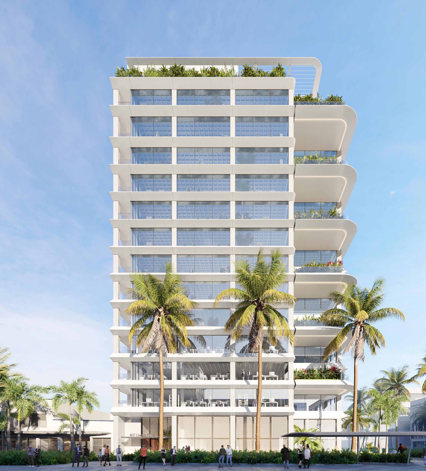 The 407 Lincoln Road building was constructed in 1955 and designed by architect Edwin T. Reeder in the Post War Modern style of architecture. The 13-story office tower was built for the Miami Beach Federal Savings and Loan Association who occupied the entire ground level and several upper office levels. The building is classified as Non-Contributing within the Flamingo Park Local Historic District. The applicant is currently requesting approval for the substantial renovation of the existing building including modifications to all four facades as well as the lobby and roof deck.