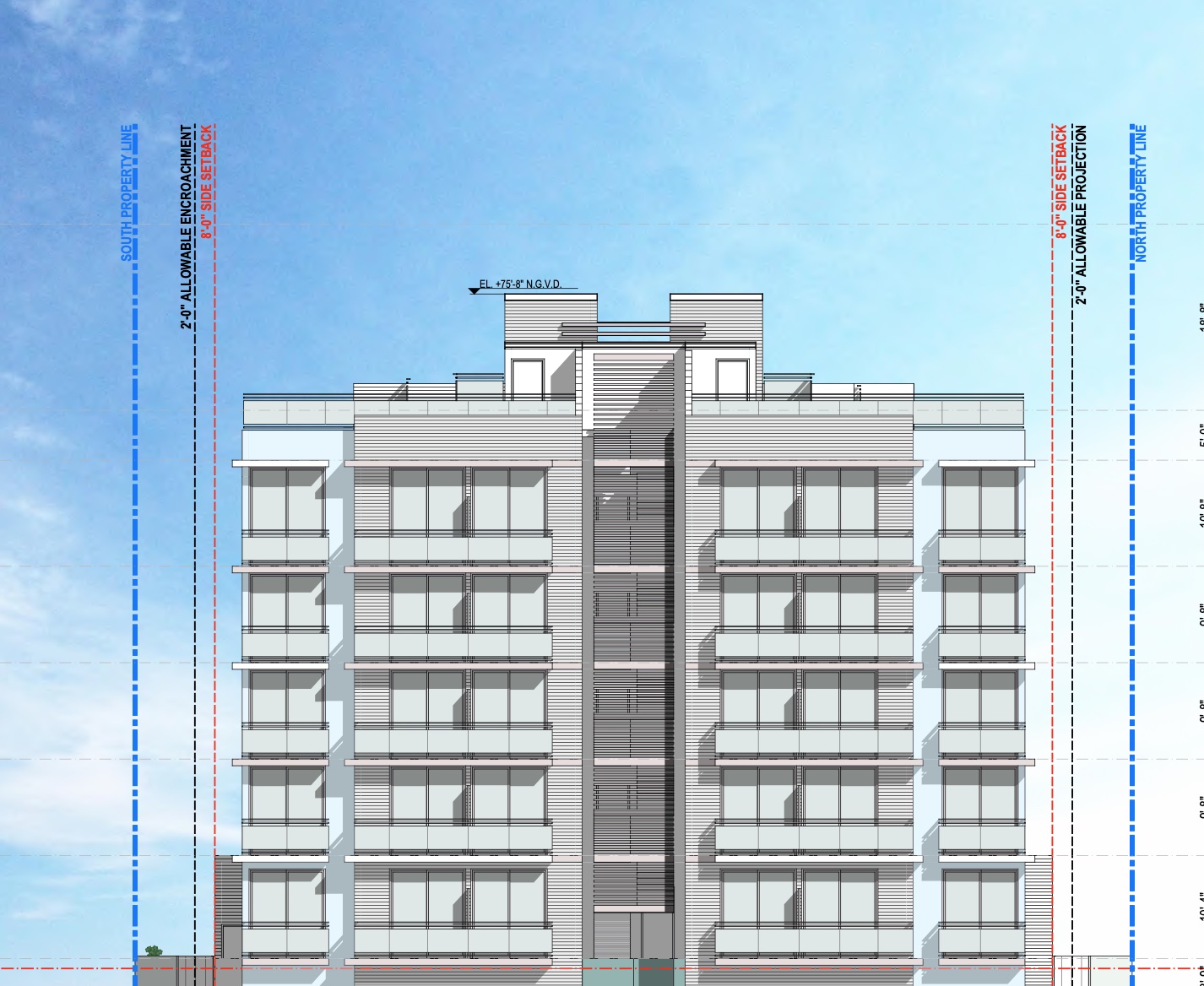 - A variance to reduce by 2’-8” the minimum required side facing a street setback of 5’-0” in order to construct a portion of the building with a setback of 2’-4” from the east side property line. Variance requested from:
