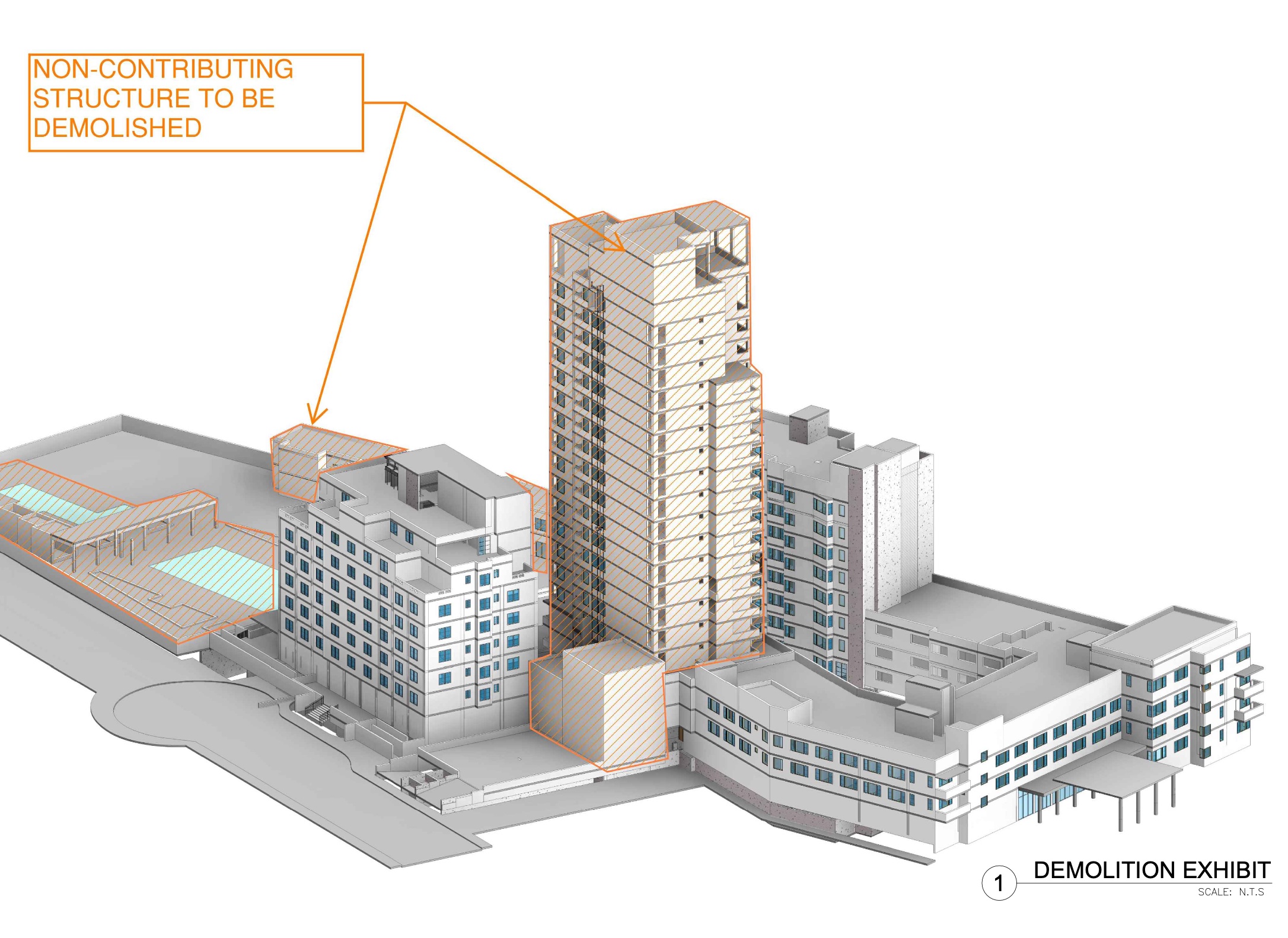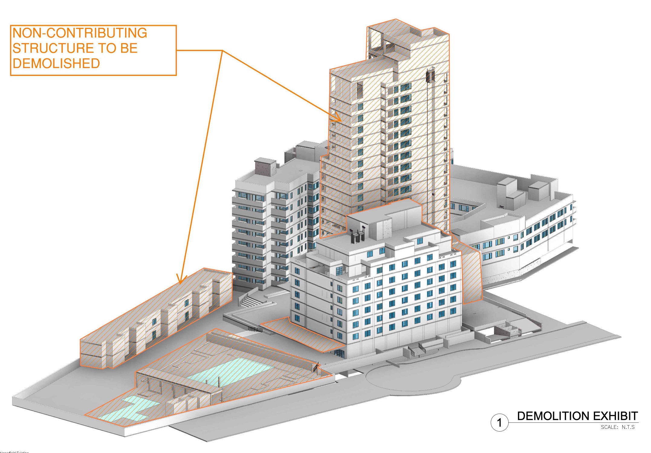 - A greater portion of the front façade of the center building is proposed to be reconstructed. Additionally, the existing decorative metal screens are proposed to be salvaged and reintroduced within the reconstructed façade. Further, the applicant is proposing to salvage additional exterior architectural features to be reintroduced within the new hotel lobby.