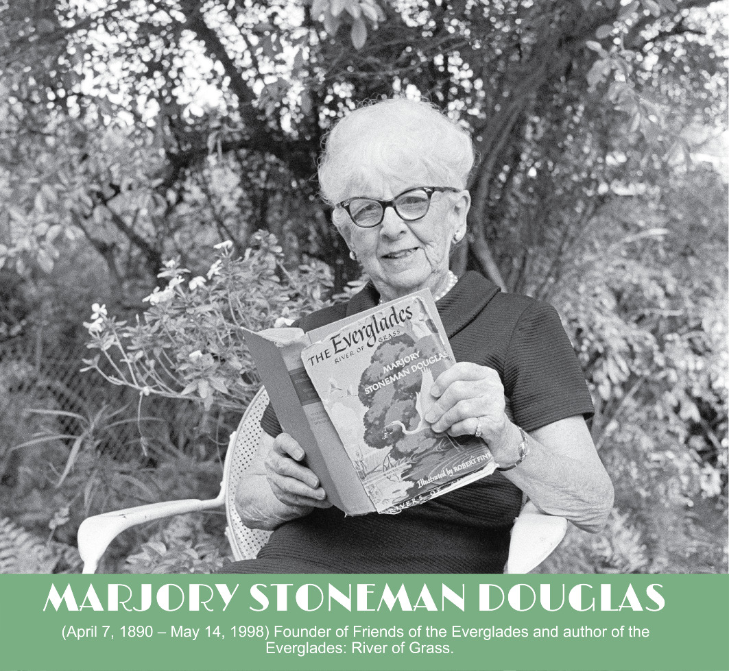 Marjory Stoneman Douglas (April 7, 1890 – May 14, 1998), founder of Friends of the Everglades and author of the Everglades: River of Grass. Her environmental work helped redefine the Everglades as a river instead of a swamp, sparing it from development.
