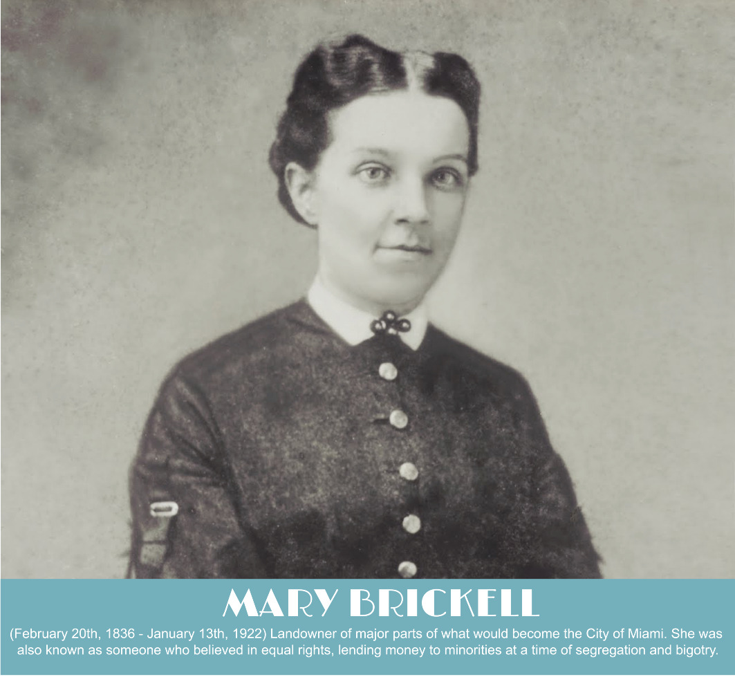 Mary Brickell (Feb 20, 1836 – Jan 13, 1922), landowner of major parts of what would become the City of Miami. She was also known as someone who believed in equal rights, lending money to minorities at a time of segregation and bigotry.