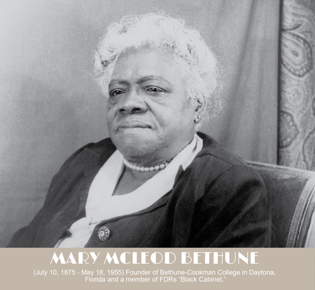 Mary McLeod Bethune (July 10, 1875 – May 18, 1955), civil rights activist and founder of Bethune-Cookman College in Daytona, Florida, national adviser and member of FDR’s “Black Cabinet.” She was deemed “acknowledged First Lady of Negro America” by Ebony Magazine in July 1949.