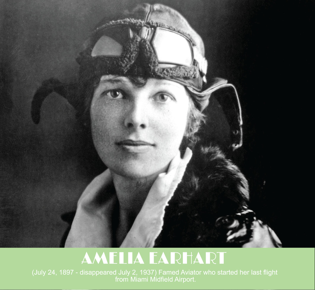 Aviation pioneer and writer Amelia Earhart, (July 24, 1897 – disappeared July 2, 1937), departed from Miami Midfield Airport on her ill-fated attempt to circumnavigate the globe. She was the first female aviator to fly solo across the Atlantic Ocean. Her journey inspired the masses in an era of innovation in technology and transport.