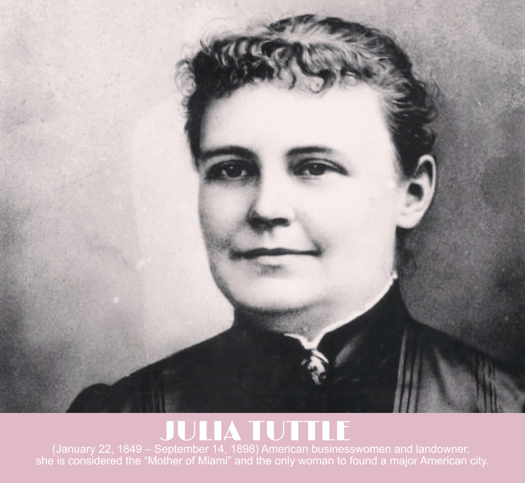 Julia Tuttle (Jan 22, 1849 – Sep 14, 1898), American businesswoman and landowner, is considered the “Mother of Miami” and the only woman to found a major American city. Her vision for the city of Miami as a Southeastern trade hub came true when Henry Flagler extended his railway to the new city of Miami.