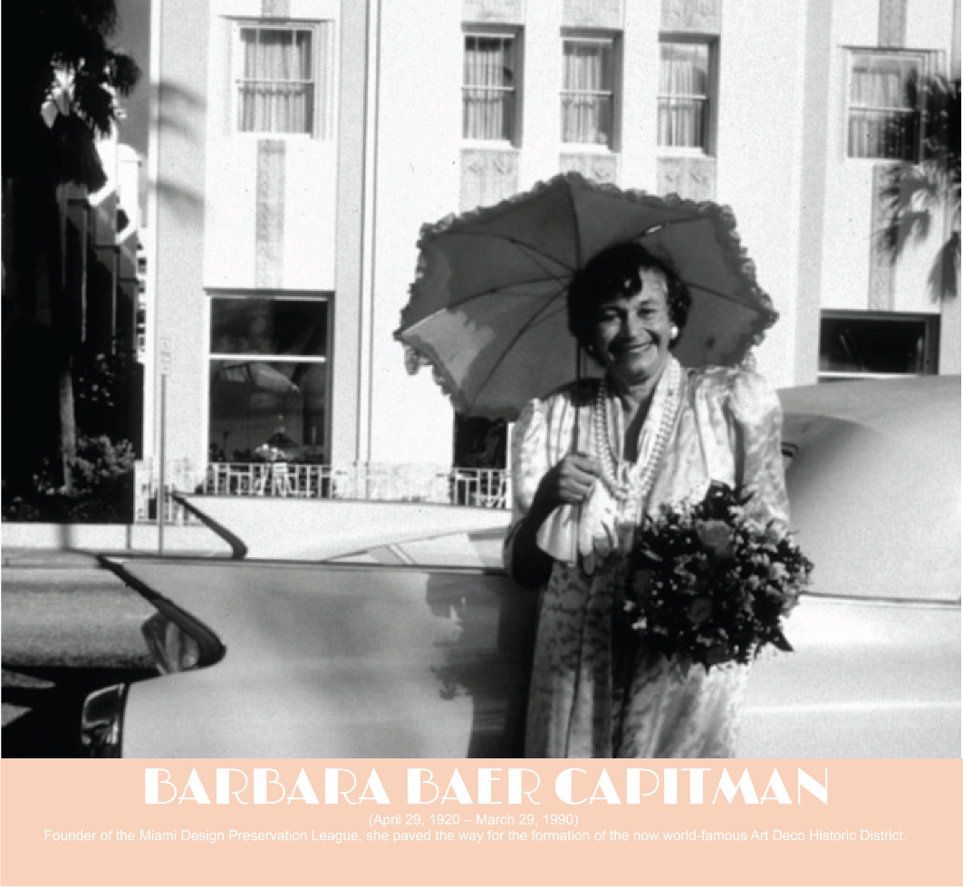 Preservationist Barbara Baer Capitman (April 29, 1920 – March 29, 1990), Founder of the Miami Design Preservation League, paved the way for the formation of the now world-famous Art Deco Historic District. Capitman’s advocacy saved countless Art Deco buildings on Miami Beach and around the country from demolition.