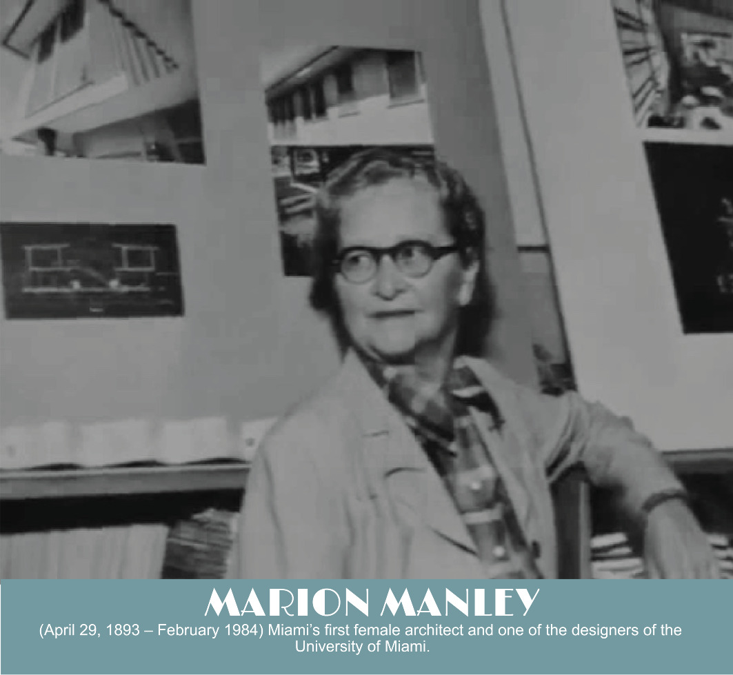 Marion Manley (April 29, 1893 – February 1984), was one of Miami’s first female architects and a major contributor to the vernacular architecture of South Florida. Manley is also one of the designers of the University of Miami.